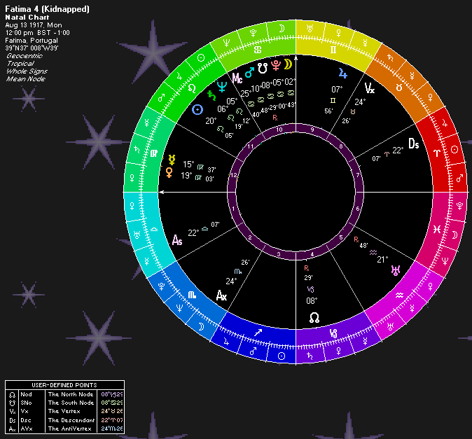 Pluto is conjunct the Moon. “Apparition of a mother.” Pluto and the Moon then semisquares the Sun to add the Godly attributes. “Apparition of an immortal mother.” The Sun and Uranus also square the Vertex, showing an important event.
