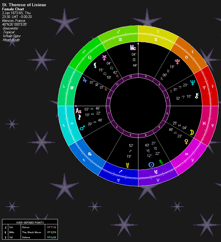 Much more can be said (observe the Saturn aspects for suffering). But, I did not plan on writing my Therese article, now. I do not like to investigate and write about saints without something more than a birth chart read, unless I plan on the article being about a blind read rather than proving or showing something new.