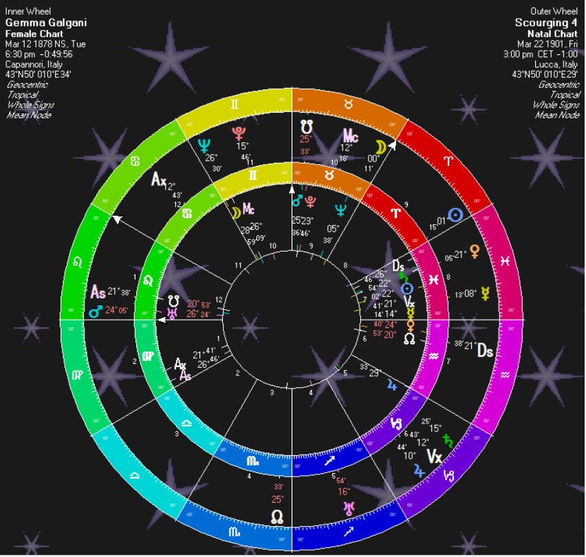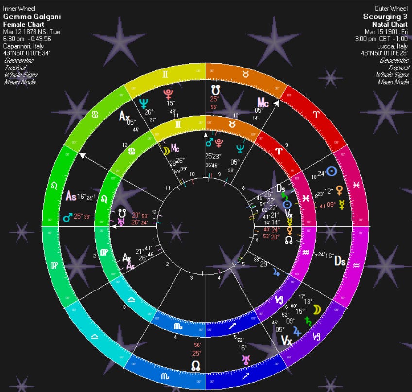 The square aspect’s nature is of Neptune and Mars. The East Planet and West planet are of Neptune-Mars and Mars-Neptune thus each arm of the aspect holds these two natures but are to be opposed. But, what happens when the square is “Mars-Conjunct Uranus Square Mars/Pluto”? Mars is the violent and bloody planet. It brings wounds and bloods. The square adds a Neptunian nature to this so that the mystical can be brought in to create a celestial scourger for Gemma. Uranus is sudden, unexpected, twisted and the strange. Pluto also has mysticism to it, but it is also a destructive planet. Johndro’s dictionary lists such words as “destroy, eradicate, devastate…” he also lists “mortification.”
