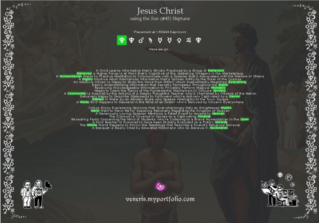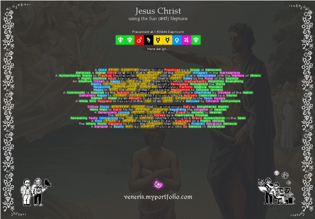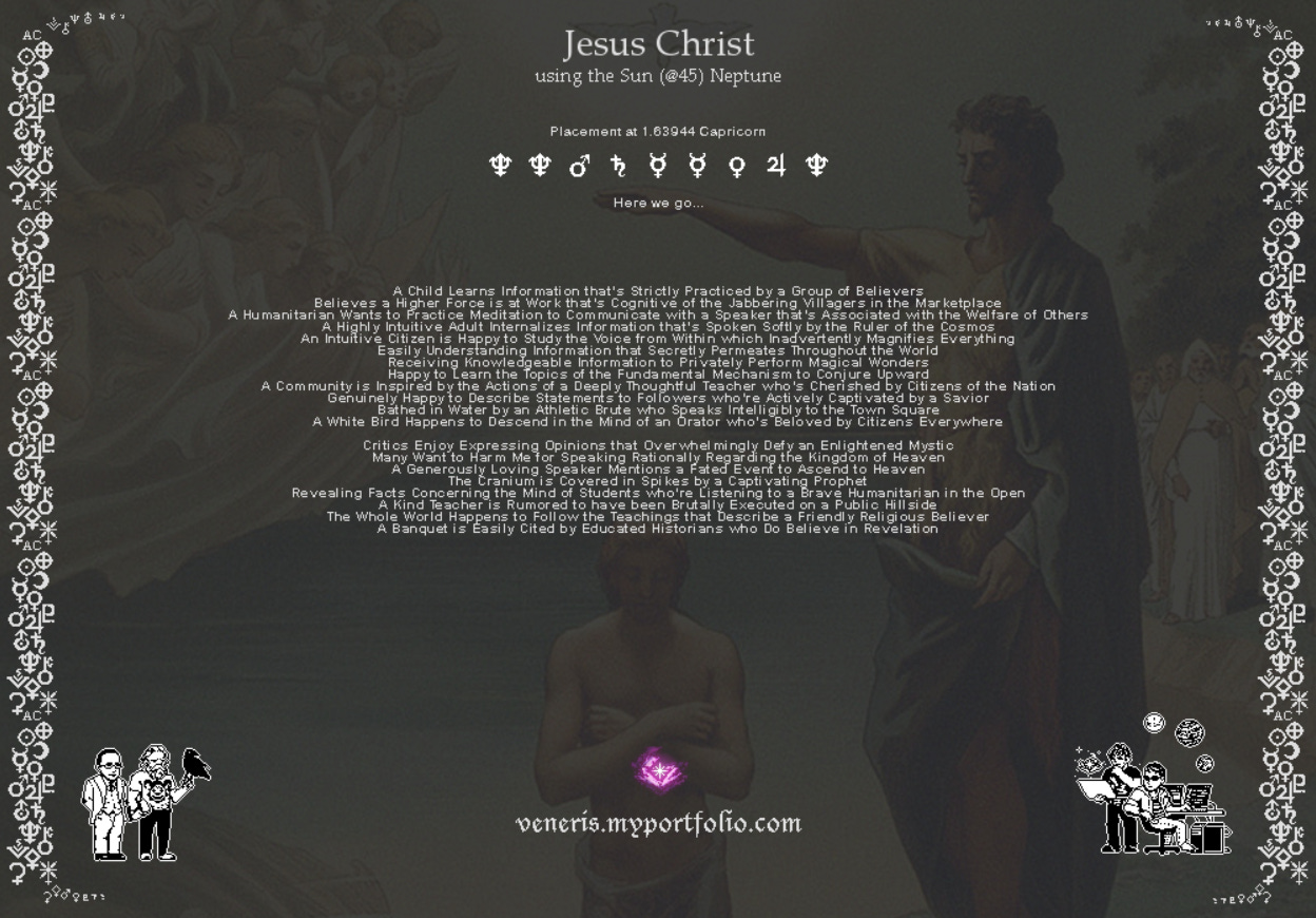 Ian Murphy likes to find a planetary placement and drill down deep into it. On this chart, he uses Jesus’ Sun semisquare Neptune. I’m only going to add a few observations: