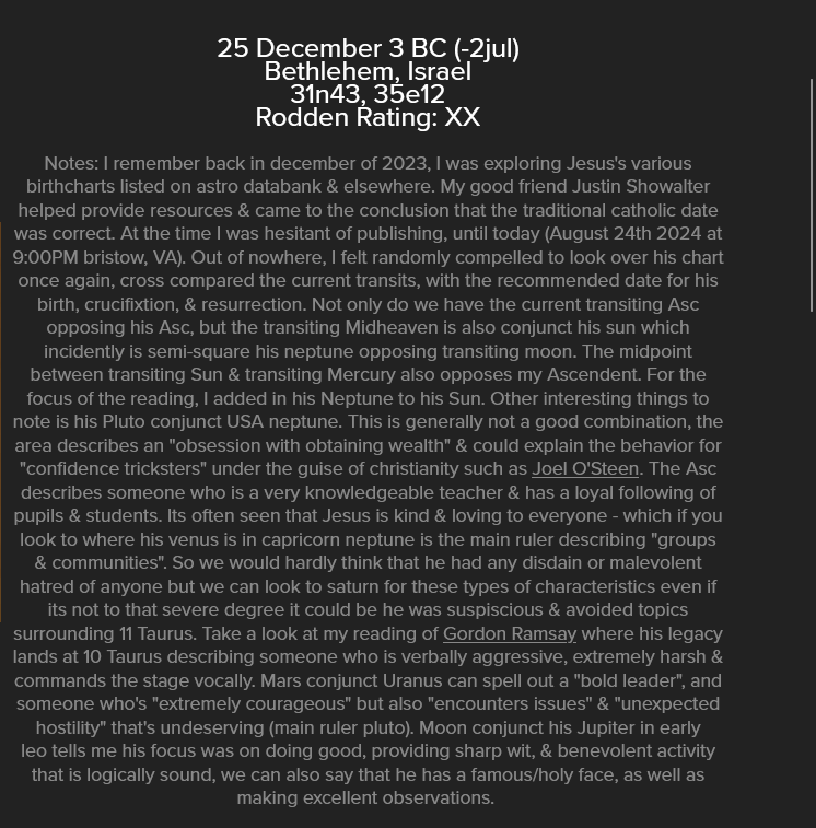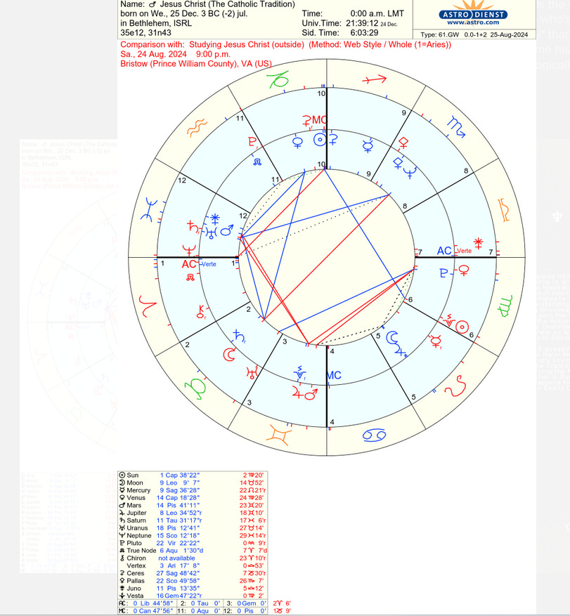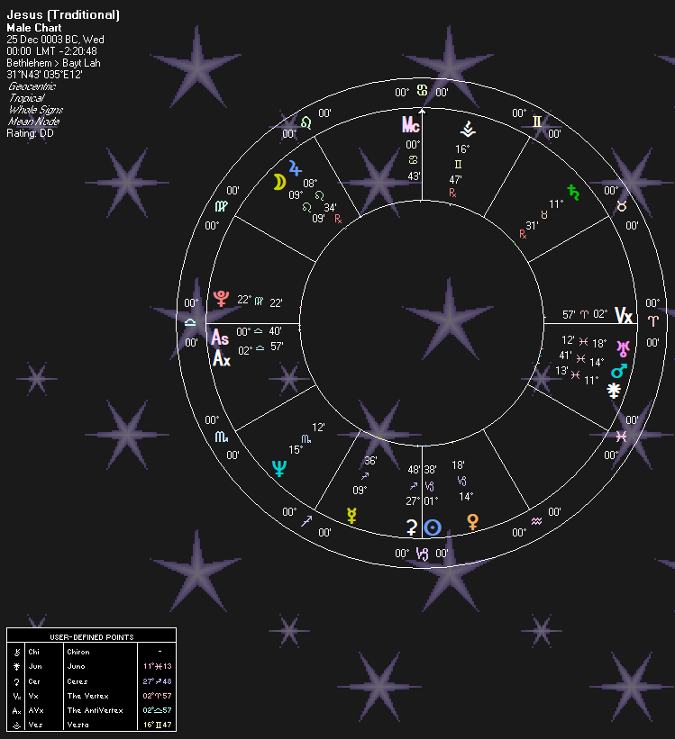 My colleague, Ian Murphy, has posted Jesus’ chart that we were working on. This is based off the traditional date and hour of Jesus birth: December 25 at midnight, 3BC. The reason why astrologers may not have found this chart before, is multitude. A major reason is that for years academics gave an older year of Christ’s birth. It was only recently that we found it to be 3 BC.