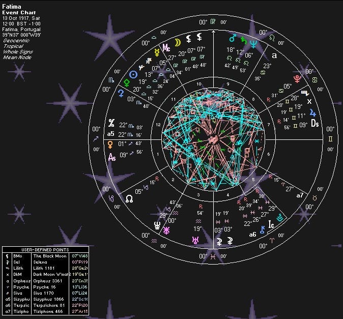 This is a read on the astrological chart cast for the Miracle of the Sun on October 13th, 12 noon, 1917. This was the last in a series of apparitions Servant of God Lucia and her two sainted siblings witnessed and interacted with. Over 70,000 people witnessed it. Mary appeared to the seers and gave visions, announced herself as “The Lady of the Rosary” and caused the sun to suddenly dry up the torrential downpour and then dance through the sky and emitting bright colored lights.