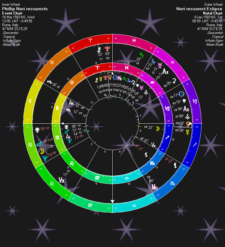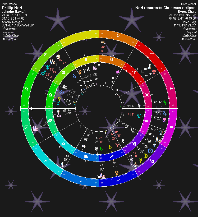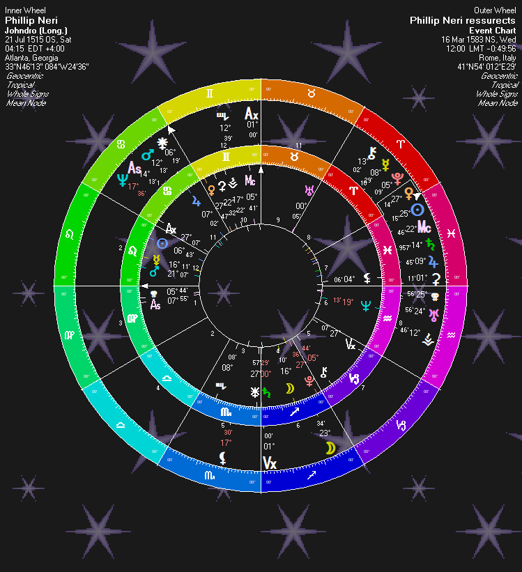 Natally, St. Phillip Neri has a Uranus-Saturn quincunx: “Resurrect (Uranus) Dead (Saturn).” And Juno (Saturnian) is right next to this aspect, as well, emphasizing it.