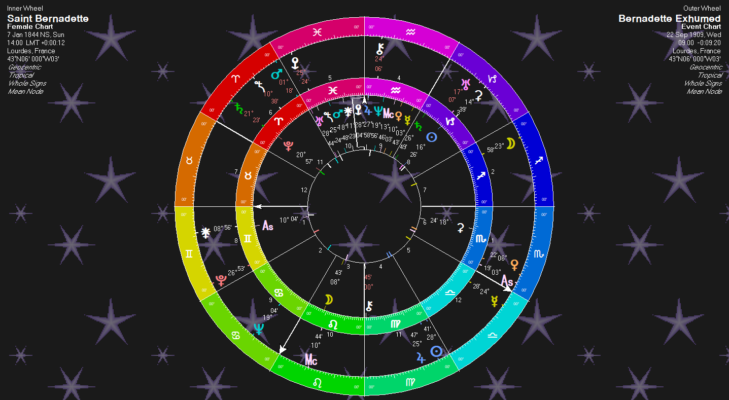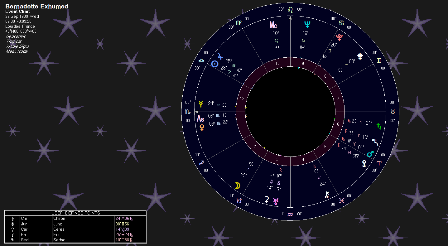 Sun square Pluto. This Pluto is almost at the same degree as Gabriele Amorth’s Mars. We saw there how the rulers of this degree show an exorcist. Here, the same rulers allow for an incorrupt corpse. This is an example of how the rulers and planets allow for a variety of circumstances within their limitations. The rulers are: Venus, Jupiter, Uranus, Pluto. “Never (Pluto) Decay (Pluto) Incorrupt (Jupiter) Girl (Venus) Miracle (Uranus).”