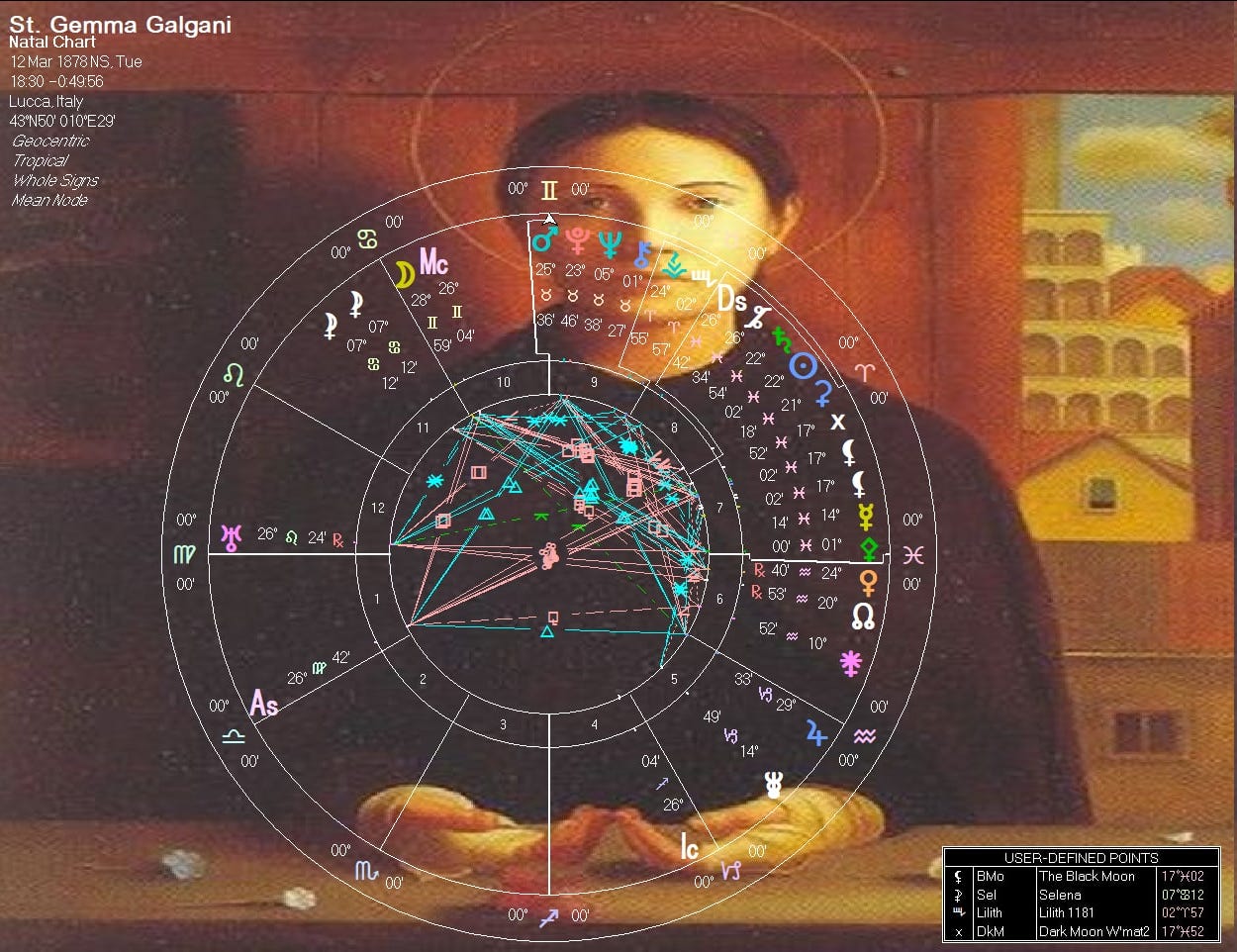 Venus squares Mars. This often points to a person who is lustful and lascivious. People with this aspect tend to toward promiscuity and other related sins. Again, I hestitate to indicate this of a saint. But, Gemma gives zero indication she ever fell in these matters. St. Gemma is a prime example of a person not being bound their natal chart. These planets are influences. Not fate. However, the Natal Chart is where the signs and planets imprint themselves onto your nature such that they are always with you (as opposed to the transits as you go through your life). St. Gemma overrode all these influences to sin in her nature.