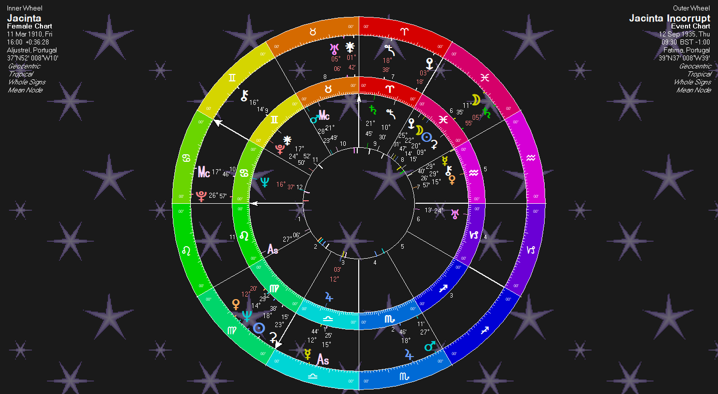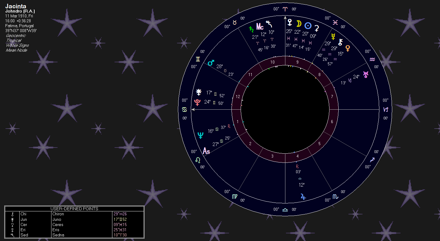 Her Medium Caeli is at 12 Aries. Mercury, Mercury, Venus, Jupiter. “Speaking (Mercury) Messages (Mercury) from Virgin (Jupiter) Woman (Venus).” Or: “Child (Venus) Speaking (Mercury) Messages (Mercury) from Virgin (Jupiter).” The Medium Caeli is the path Heaven set for a person. So, the Johndro Chart for Fatima and Jacinta shows St. Jacinta’s path as being a seer of Fatima.