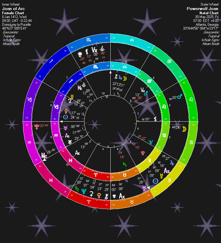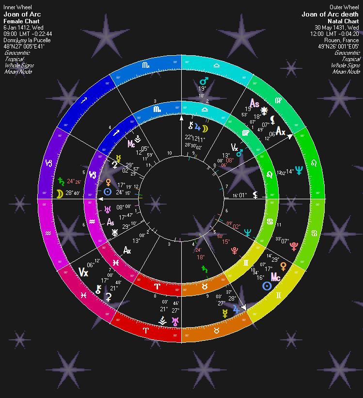 As an important historical figure, St. Joan surely has all kinds of historical dates I could look at. I am not terribly familiar with the saint and so can’t deal write an extensive research article on her. This article is an exercise in validating a birth chart. But, one final chart to show this is St. Joan’s chart: