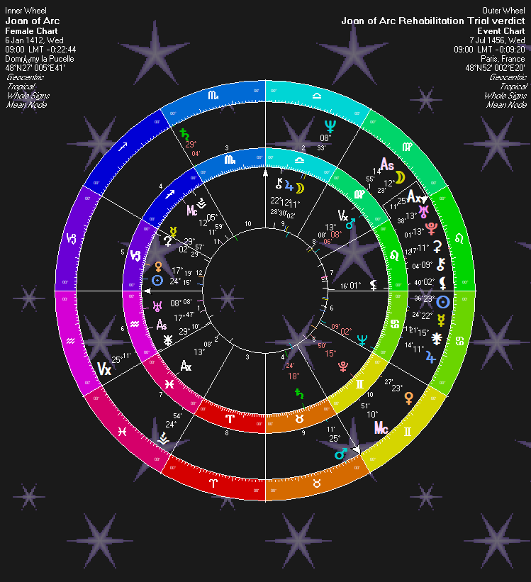 The most notable fact is there is a solar opposition. This shows it is Joan’s day. Transit Sun is conjunct Transit Mercury semisextiling Venus: “Day (Sun) Joan (Joan’s Sun) Declared (Mercury) Innocent (Venus).” In transit, Uranus and Pluto are conjunct. “Reverse (Uranus) Crime (Pluto).”