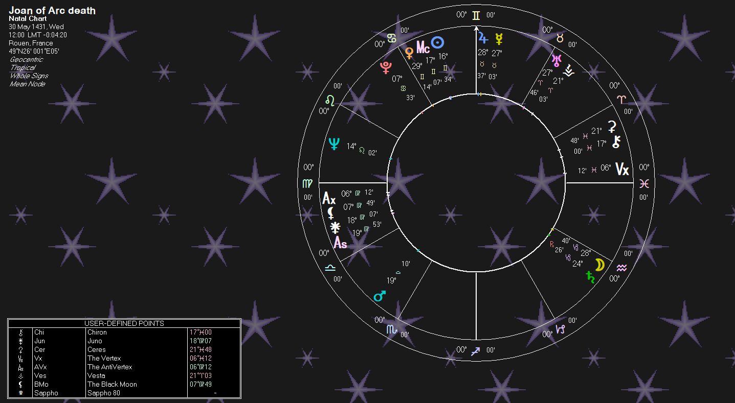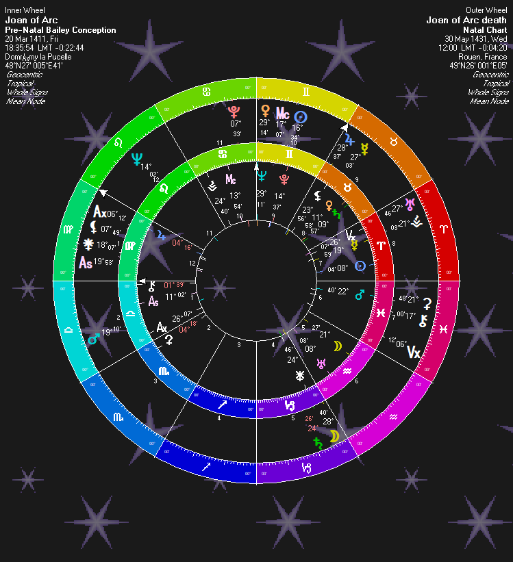 Transit Saturn and Moon are conjunct the prenatal Juno. This is a death transit akin to a Saturn Return. This conjunct is opposing her prenatal Vesta in Cancer: “Virgin (Vesta) Dies (Saturn-Juno) by Fire (Mars-Cancer).” Prenatal Mars is semisextile her prenatal Moon, as is the Transit Ceres (Moon) conjunct this: “Torched (Mars) Girl (Moon/Ceres).” Transit Mars opposes her prenatal Aries Mercury and Transit Vesta. Mercury is any communication. St. Joan had her famous last words and prayers that showed a saint was being executed. “Virgin (Vesta) Confessing/Praying (Mercury) in Flames (Mars).”
