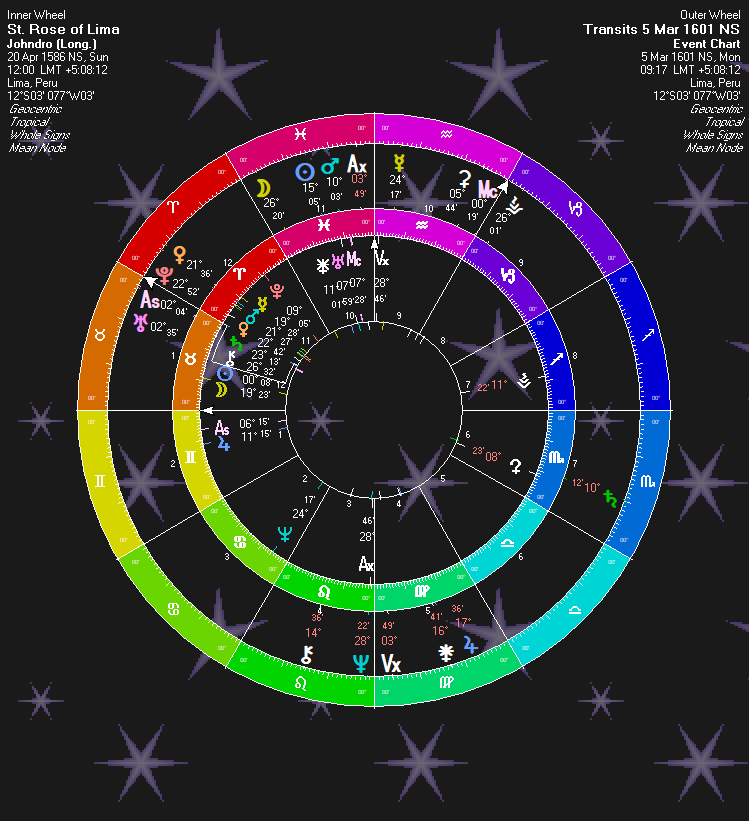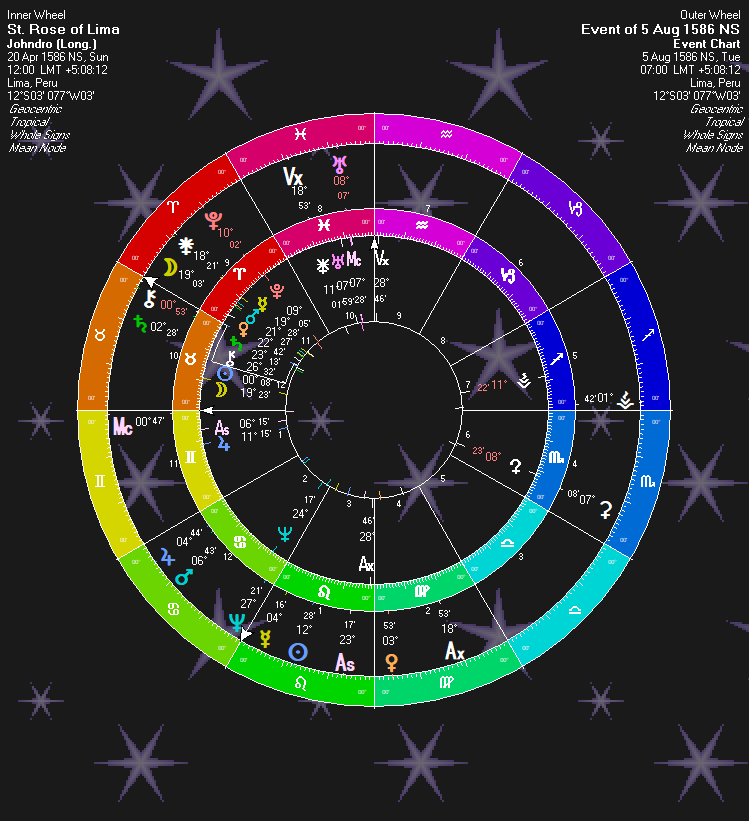 It may be impossible to know when she made her vow of virginity. But, I like this as a chart. If nothing else, it is demonstrative of what we would be looking for in virginal vows. Throughout the given timespan, Jupiter and Juno are conjunct. “Virgin (Jupiter) Vow (Juno).” This opposes transit Sun to give “Day of Virgin Vow.” Jupiter is also parallel her Saturn, again, “Virgin Vow.” The Suns are in semisquare, demonstrating an important event. Transit Moon is making a number of aspects to Rose’s natal chart: A 105 aspect to her Jupiter; a 75 degree aspect to Juno, and a 15 degree aspect to her Vesta. Transitting Vesta is in a sextile with Transit Moon. So, lots of “Girl” (Moon) and “Vow” (Juno) and Vesta which is named for religious virgin girls.