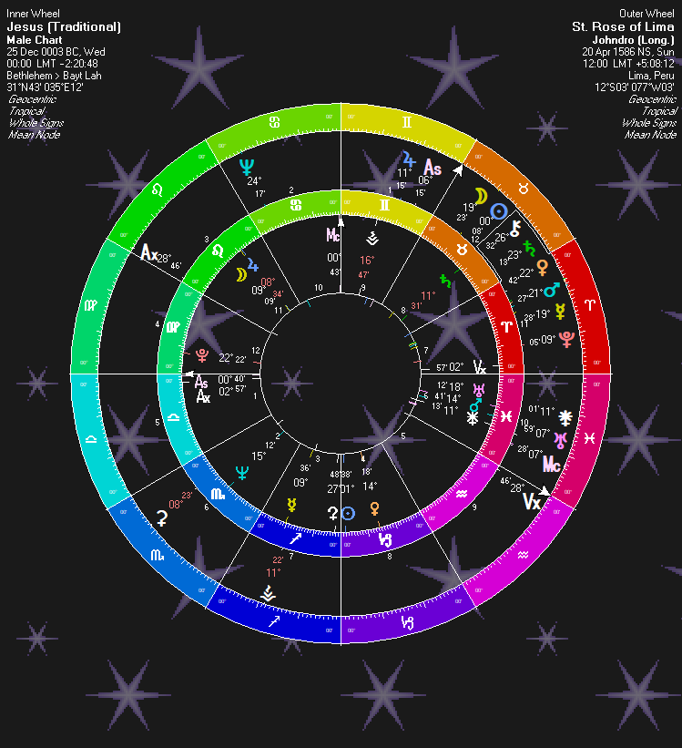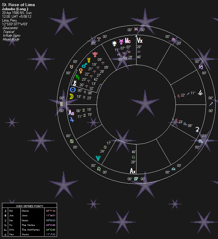 She became a Third Order Dominican, a lay religious order. Third Orders of monastic orders allow a person to live a normal life, while still being involved in a monastic order. However, St. Rose pretty much lived as a nun, but in a room attached to her family home. Rose had visitations from Mary, infant or child Jesus, and St. Catherine of Sienna. She also had demonic visitations as well as nightly visions of being in Hell. Her Neptune squares Saturn: “Horrific (Saturn) Visions (Neptune).” Regarding the Heavenly visitations: Her Neptune semisquares Jupiter to explain the Holy Visitations. Pluto in Aries is “Mystical (Pluto) Communications (Mercury).”