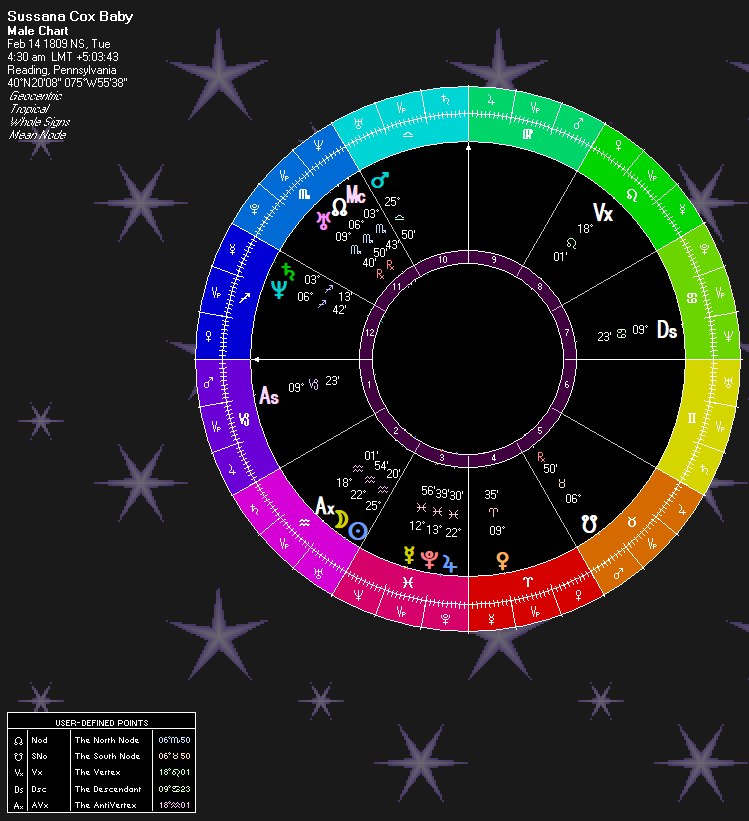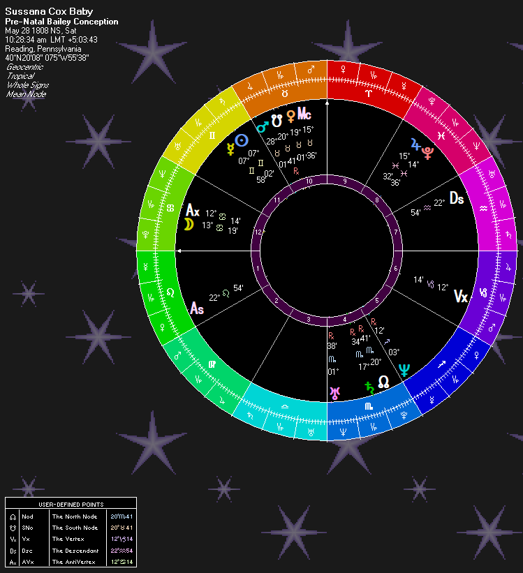 The Marses are interesting. Transit Mars opposes Saturn and squares the natal/death Sun/Moon conjunction. However, look at the rulership: Mars in late Taurus is ruled by Venus with Jupiter as a subruler. We see “baby” (Venus) and affection and other beautiful things. Venus is in the same sign in mid-Taurus at 19 degrees in its own rulership. Here, it opposes Saturn in its own conception chart: Cold (Saturn) Baby (Venus). Or Dead Baby. It then squares Natal Moon on the birth chart: Mother’s (Moon) Baby (Venus). Mars is squaring Sun. I could read it as all manner of murder (Mars) against Life (Sun). But, with Mars in such a benefic rulership I read it as showing the death and nothing more.