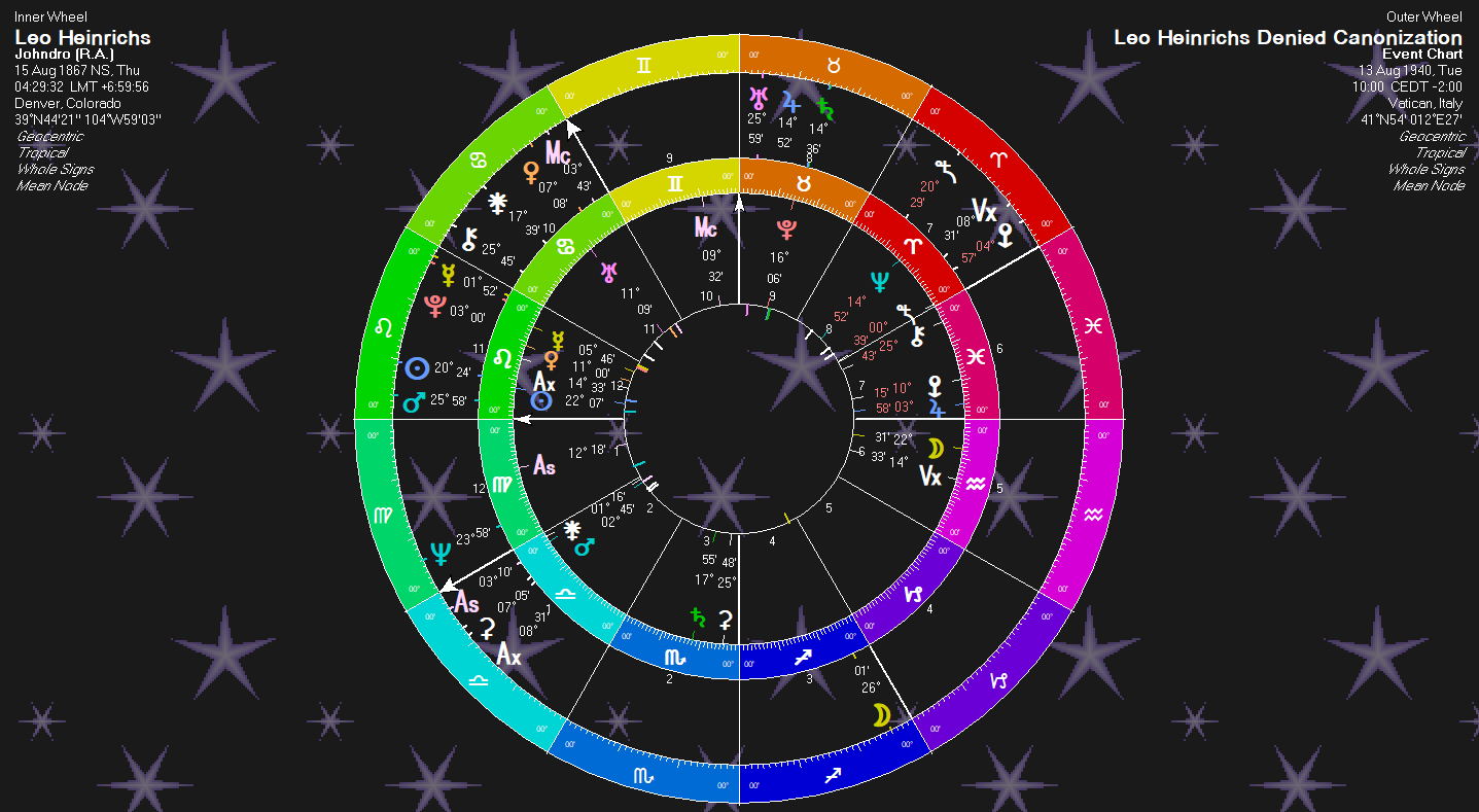 Transiting Sun, and his natal Sun, squaring his natal Saturn: “Glory (Sun) Denied (Saturn).” The Great Conjunction is at a semisextile with Heinrich’s Neptune, Heaven and Catholic Church, showing the activity is connected to his beatification cause. hTransiting Jupiter and transiting Saturn conjunct his Pluto spell the same thing: "Denial (Saturn) of Glory (Jupiter)." Or “Unfit (Pluto) for Godliness (Jupiter).” Or “No (Pluto) Glory (Jupiter) in Death (Saturn).”