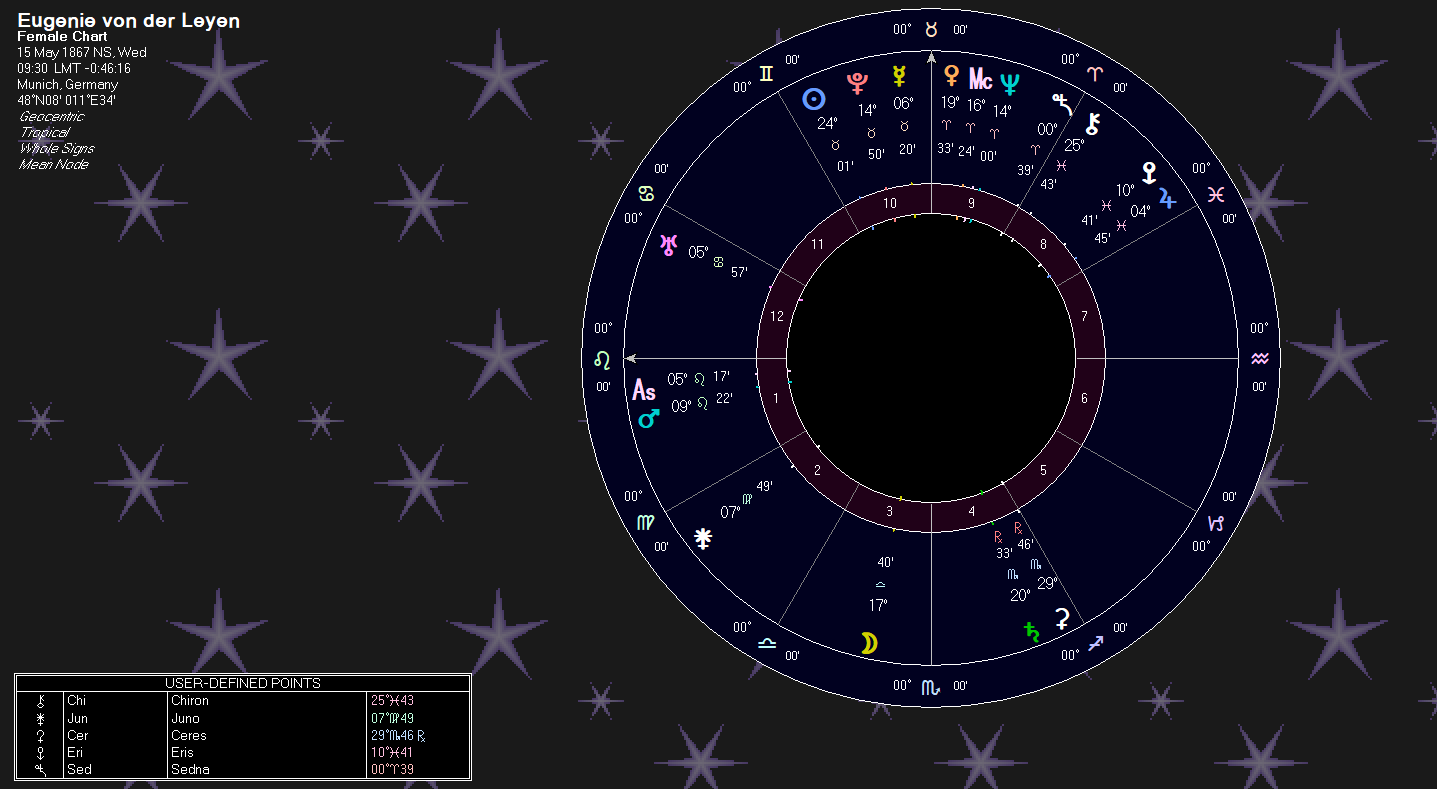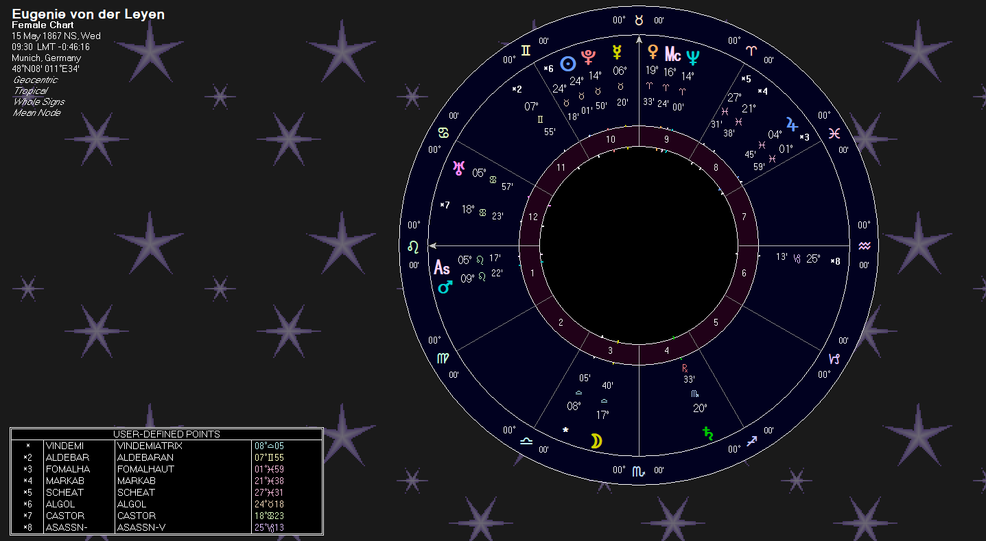Eugenie’s Sun is conjunct Algol, The Demon Star. Literally, “life full of demons.”