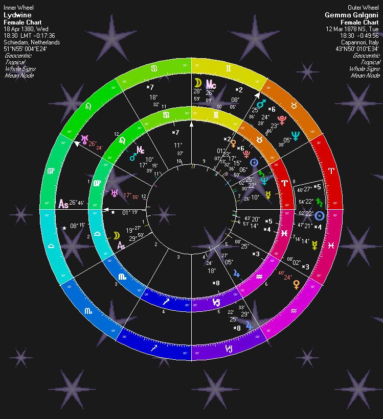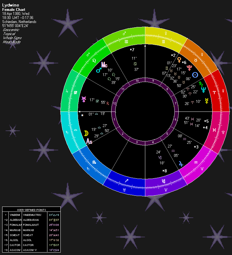 Lydwine’s Pluto is just past 15 degrees. At this degree, Taurus’ rulership shifts to Venus (“Fragrant” [Venus] Body [Earth element sign]”) which is in its sign, latter Taurus. The subrulership shifts to Jupiter. And then Neptune and finally Saturn. The subrulers are of mysticism and chastity and celibacy. The sentence can be produced: Confined (Saturn) Religious(Jupiter)/Celibate (Jupiter or Saturn) Mystic/Catholic (Neptune) Young Woman (Venus).