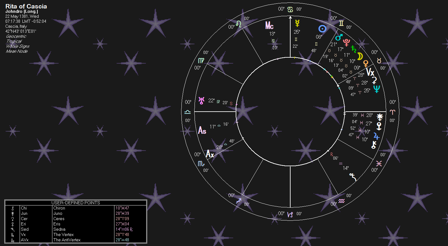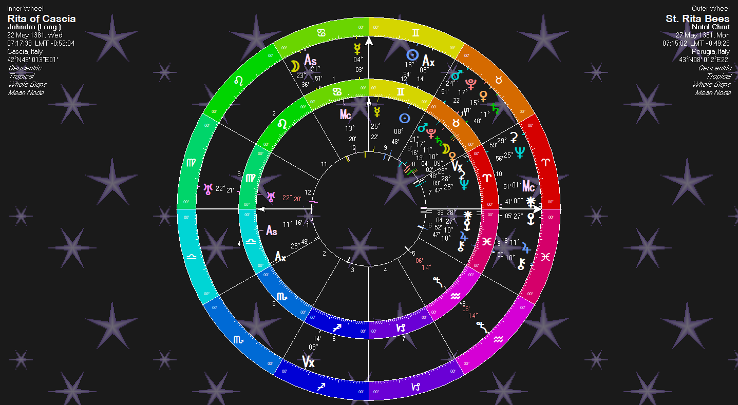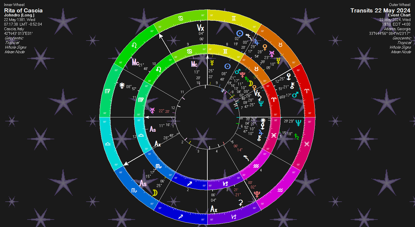 A note: While I’ve created St. Rita’s birth chart about a year or two ago, I never started to write about her. This post I began on May 22nd, her feast day. I did not realize this until sometime in the process of writing this post. The transits show Mercury on her Venus and Moon (Writing about a girl), and of course the Solar Return.