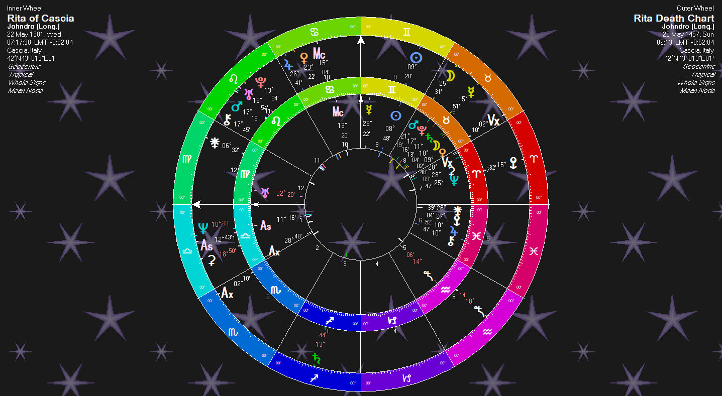 Numerous miraculous events surround her death, as they did her life. Her death was on her Solar Return. This does allow for some events witnessed, such as the miraculous light (Sun) that shone at her death. The more important aspects, though, are Transit Venus on her Uranus/Mars trine. Venus is “fragrance" and “youth” and “beauty.” Uranus is “miracle.” Immediatly at her death, St. Rita’s body shone with a light, her body became years younger and soft and supple, and emitted the odor of sanctity. Her head wound shone a bright red light and the worms became light, sparkled, and disappeared.