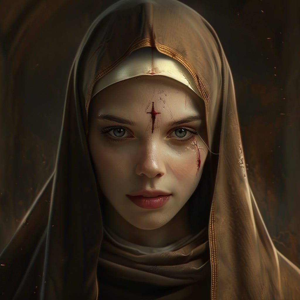 One day, St. Rita went out to hear a famous preacher. She returned convicted of the Lord’s suffering. She prostrated herself in prayer and begged Jesus to give her one of his thorns. Jesus granted this request and launched a thorn into the middle of her forehead. Rita felt intense pain and fainted from it. She recovered with the thorn still in her forehead. The wound it created survived to her death and never recovered. Rather, it festered and grew worse to the point that the other nuns did not wish to be around Rita. So, Rita would often confine herself to her cell.