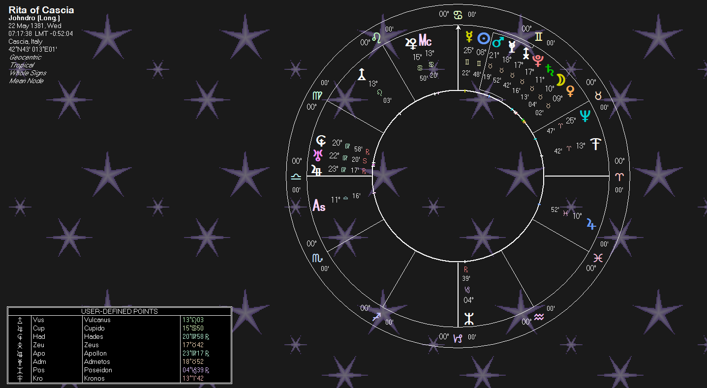 The trine between Uranus and Mars has alot of activity. Not the least being the conjunct with Pluto and Algol. Algol is at 17 Taurus on this chart, since St. Rita was born hundreds of years ago in the 1300s. The subrulerships for 17 Taurus, are different than the rulerships for the other stigmatists we’ve observed: Venus, Jupiter, Neptune, Saturn. Only the R4 rulership is a malefic. Today, Algol sits in Plutionian degrees, but the fact that stigmatists living in different centuries all have Algol aspects says the star has its own meaning, apart from what degree it is in, just as a planet or angle does. Just as the other stigmatists with an Algol conjunct suffered from onslaughts of demons, so did St. Rita. She bore them with patience and calmly exorcised the demons from herself and others using simple words of blessing.