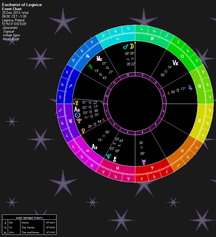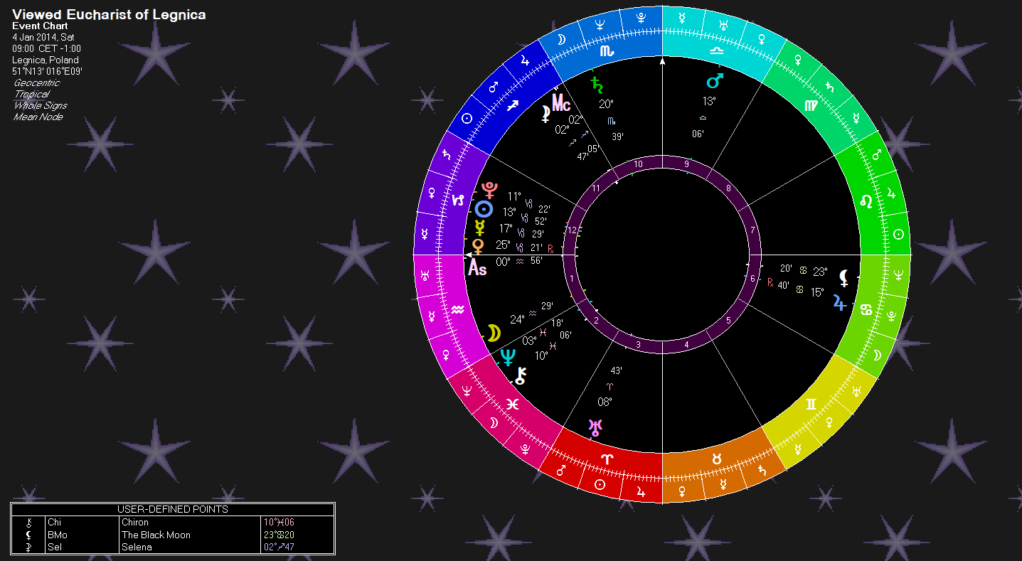 Communion might happen half an hour to an hour later depending on whether the mass had singing or not. Regardless, the miracle was not visible during the mass. Mars is eight degrees off from Moon. Some astrologers call that a conjunct, others don’t. I do. Because it works and makes sense.