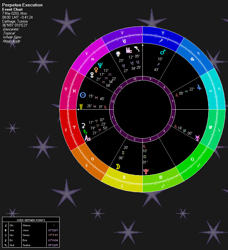 March 7 203 is the date of the execution. This is the traditional date and is corroborated between the clues in the Passio and early evidence from 354. Perpetua we understand to have been born in 182, simply working backward from her age at death we are given. We also have her likely place of birth as Carthage. However, without a birthdate, we cannot build a natal chart for her. But, we can have some fun and look at her execution chart. On this day, multiple Christians were rounded up and killed in bloodsports. What a way to go.