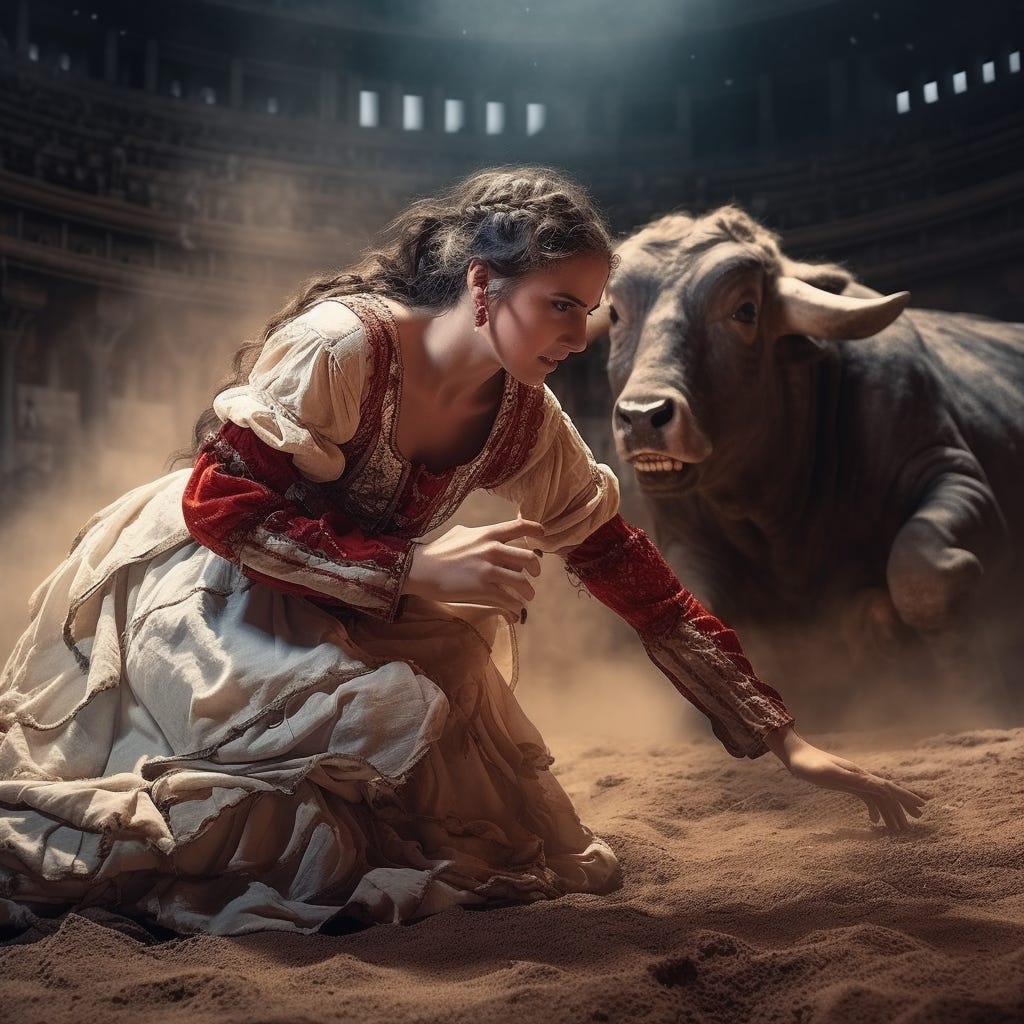 But for the women the devil had made ready a most savage cow, prepared for this purpose against all custom; for even in this beast he would mock their sex. They were stripped therefore and made to put on nets; and so they were brought forth. The people shuddered, seeing one a tender girl, the other her breasts yet dripping from her late childbearing. So they were called back and clothed in loose robes. Perpetua was first thrown, and fell upon her loins. And when she had sat upright, her robe being rent at the side, she drew it over to cover her thigh, mindful rather of modesty than of pain. Next, looking for a pin, she likewise pinned up her dishevelled hair; for it was not meet that a martyr should suffer with hair dishevelled, lest she should seem to grieve in her glory. So she stood up; and when she saw Felicity smitten down, she went up and gave her her hand and raised her up.. And both of them stood up together and the (hardness of the people being now subdued) were called back to the Gate of Life. There Perpetua being received by one named Rusticus, then a catechumen, who stood close at her side, and as now awakening from sleep (so much was she in the Spirit and in ecstasy) began first to look about her; and then (which amazed all there), “When, forsooth,” she asked, “are we to be thrown to the cow?” And when she heard that this had been done already, she would not believe till she perceived some marks of mauling on her body and on her dress. Thereupon she called her brother to her, and that catechumen, and spoke to them, saying: Stand fast in the faith, and love you all one another; and be not offended because of our passion.