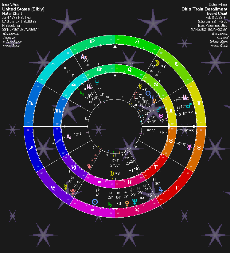 On the Sibly chart, Mars is in 7th House showing a public relations disaster and harm to the public. It sits on USA’s Descendant and opposes Ascendant, further showing harm to the people. Mars is also conjunct Uranus which represents trains and rails, as well as explosions. Mars is also about epidemics and poison and the like, in mundane astrology.